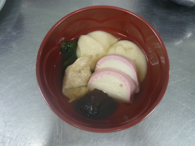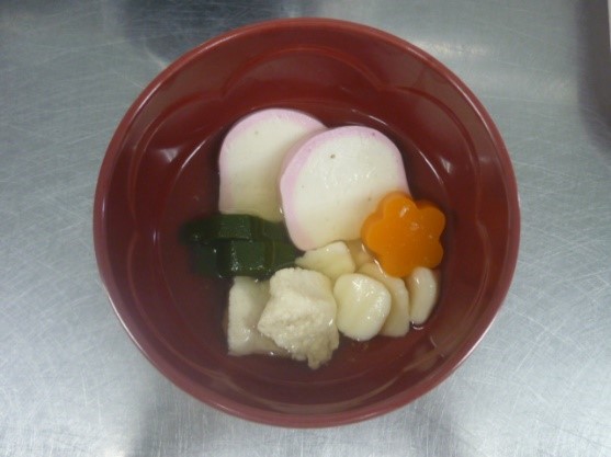 お雑煮は各地域に特色があり、その土地の特産物や気候、歴史的背景などが反映されていると言われています。山口のお雑煮では、丸餅を使い、すまし汁で食べるのが一般的なお雑煮とされ、他にも鶏肉やかまぼこ、するめを入れる雑煮など県内でも地域性がみられるようです。当院の「お雑煮」には丸いお餅が入っていますが、お餅を安全においしく食べていただくため当院のお餅は「ソフト食」のお餅にして提供します。さらに飲み込みや咀嚼に配慮の必要な患者様の雑煮では鶏肉はソフト食にし、野菜もゼリーに仕上げてから、飾り切りにしています。普通食と同じ盛り付けになるように、切り方も工夫し見た目から楽しんでいただけるよう頑張りました。