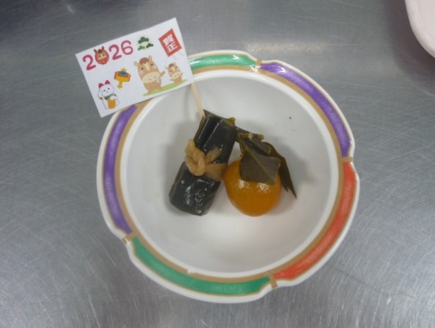 そして、元旦の朝に提供した「金柑の甘露煮」の金柑(きんかん)は『金冠(きんかん)』を表し、名前に【ん】が付くことから「金運」を上げる縁起のいい食材とされ、飲み込みや咀嚼に配慮の必要な患者様には、金柑もソフト食にして提供しました。